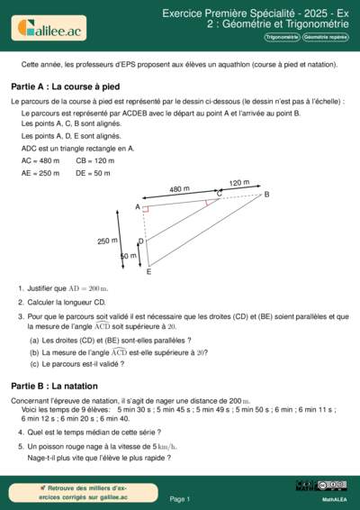 Cet exercice, bien que posé dans un contexte de Brevet, mobilise des compétences fondamentales de géométrie plane essentielles pour le programme de Première Spécialité, notamment dans l'étude des configurations et la manipulation des vecteurs ou du produit scalaire ultérieurement. L'objectif est de vérifier la validité d'un parcours d'aquathlon en utilisant des outils de géométrie classique (Théorèmes de Pythagore, Thalès) et de trigonométrie, complété par une analyse statistique de données de performance.