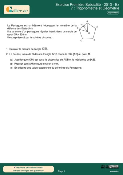 Cet exercice, extrait du sujet Amérique du Nord 2013, porte sur l'étude géométrique d'un polygone régulier : le Pentagone. Bien qu'initialement posé au niveau brevet, ses concepts fondamentaux (angles au centre, trigonométrie, propriétés des triangles isocèles) constituent le socle nécessaire pour aborder le programme de Première Spécialité, notamment le chapitre sur la trigonométrie circulaire et les coordonnées polaires.