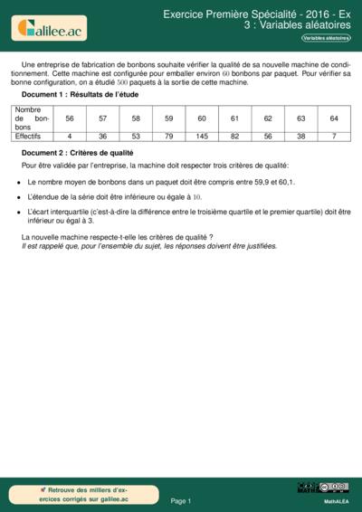 Cet exercice, bien qu'issu d'un sujet de 2016, constitue une excellente révision pour le programme de Première Spécialité, notamment pour consolider les bases des variables aléatoires et des indicateurs de position et de dispersion. L'objectif est d'évaluer la conformité d'une machine industrielle de conditionnement de bonbons en s'appuyant sur trois critères statistiques précis : la moyenne, l'étendue et l'écart interquartile.