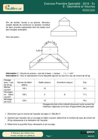 Cet exercice, bien qu'issu d'un sujet de 2016, constitue une base de révision fondamentale pour les élèves de Première Spécialité. Il permet de mobiliser des compétences de géométrie dans l'espace et de modélisation mathématique. L'objectif est de décomposer un solide complexe (un escalier de piscine) en deux solides élémentaires : des prismes droits à bases triangulaires. Pour réussir, il est crucial de maîtriser le calcul d'aire d'un triangle rectangle et la formule du volume d'un prisme ($V = \text{Aire de la base} \times \text{hauteur}$).