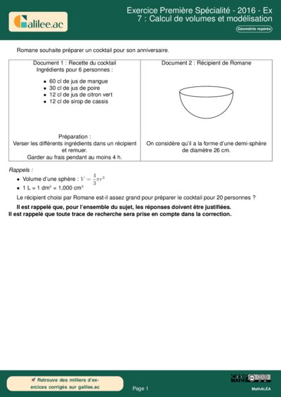 Cet exercice, bien qu'issu d'une session de 2016, constitue un excellent support pour réviser la géométrie dans l'espace et la modélisation mathématique en classe de Première Spécialité. Il sollicite la capacité de l'élève à extraire des données numériques d'un document complexe (recette et caractéristiques techniques d'un récipient) et à les articuler pour répondre à une problématique concrète de volume et de proportionnalité.