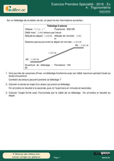 Cet exercice, extrait du sujet Amérique du Nord 2016, propose une mise en situation concrète autour du fonctionnement d'un télésiège en station de ski. Bien que d'apparence simple, il mobilise des compétences fondamentales de la classe de Première Spécialité : la gestion des grandeurs composées (vitesse et débit), la conversion d'unités temporelles et l'utilisation de la trigonométrie dans un triangle rectangle pour modéliser une pente.