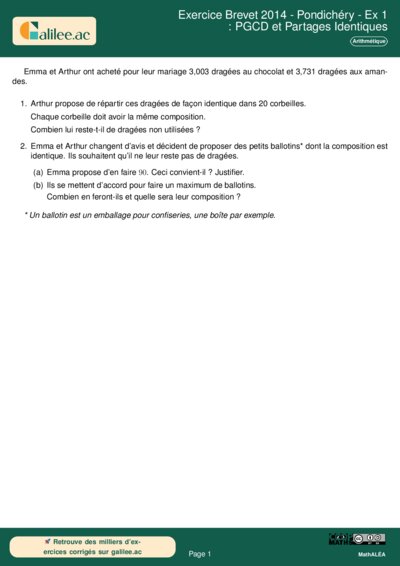Exercice Brevet 2014 - Pondichéry - Ex 1 : PGCD et Partages Identiques