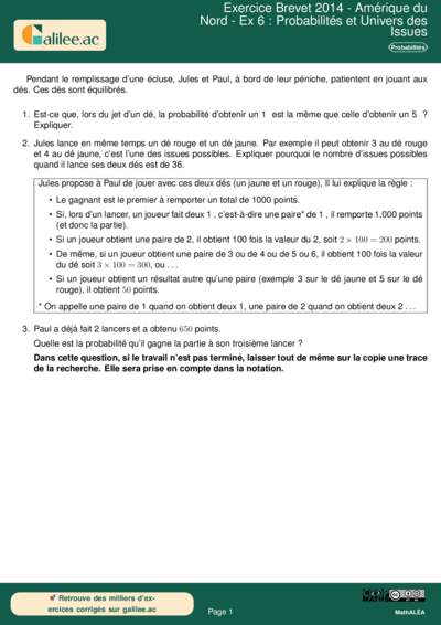 Exercice Brevet 2014 - Amérique du Nord - Ex 6 : Probabilités et Univers des Issues