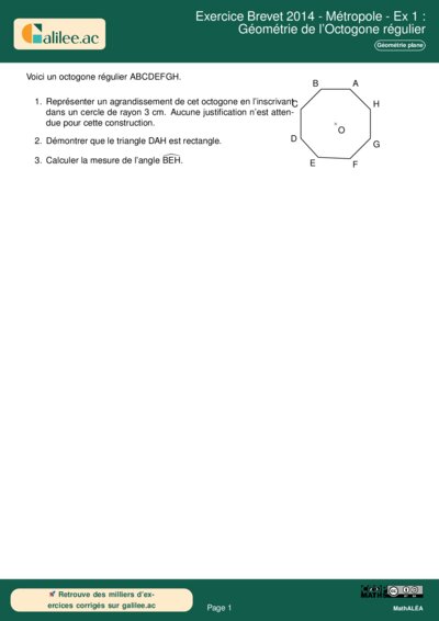 Exercice Brevet 2014 - Métropole - Ex 1 : Géométrie de l'Octogone régulier